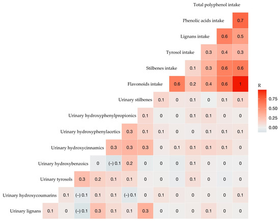 Heatmap of the Pearson correlation between subclasses of urinary MPM and energy-adjusted (poly)phenol intake in adolescents.