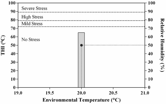Thermal and hygrometric records were carried by means of a data logger (Gemini, UK); they followed the normal seasonal pattern for the location (environmental temperature 20 °C, relative humidity 50%; temperature–humidity index value, THI, of 65 °C) (Figure 1). The THI value was calculated using the U.S. Weather Bureau’s Temperature–Humidity Index Formula [19].