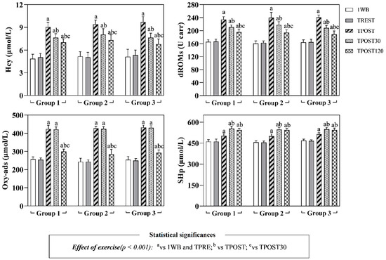 Increased dROMs values were found after exercise in each studied group, which highlights the occurrence of the oxidative process during exercise [31,32]. The increase in dROMs could be related to the rise of oxygen-carrying erythrocytes as well as of hemoglobin concentration due to an increase in the blood cell–volume ratio known to occur during exercise [31]. Higher dROMs after exercise may also be explained by the increase in glucocorticoids and catecholamine associated with stress, which, as previously demonstrated [26], contributes to the generation of reactive oxygen species. Furthermore, the exercise-related changes in the oxidant/antioxidant equilibrium could be due to increased mitochondrial electron transport within muscle cells. Notably, the highest dROMs values were found immediately after the race followed by a gradual decrease 30 and 120 min after the end of exercise in all investigated groups. The same trend was observed for Hcy concentration. In agreement with these results, previous studies showed higher Hcy concentrations after acute exercise, a training period or after a specific sport competition [33,34]. High Hcy concentration plays a role in skeletal muscle weakness [18], indeed it is associated with physical function decline. Other authors demonstrated reduced Hcy concentrations after a training period [35,36].