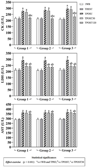 Mean values ± standard deviation (±SD) of serum creatine kinase (CK), aspartate aminotransferase (AST) and lactate dehydrogenase (LDH) measured 1 week prior to the race (1WB), the day of the race at rest (TREST), immediately after the race (TPOST), and after 30 (TPOST30) and 120 min (TPOST120) in Thoroughbred racehorses belonging to Group 1 (1200 m race), Group 2 (1600 m race) and Group 3 (2000 m race).