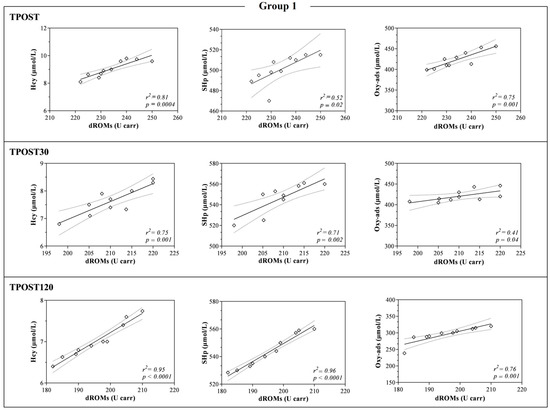 Linear regression values obtained between the serum concentration of reactive oxygen metabolites (dROMs) and the values of homocysteine (Hcy), thiol antioxidant barrier (SHp) and antioxidant barrier (Oxy-ads) obtained immediately after the race (TPOST), and after 30 (TPOST30) and 120 min (TPOST120) in Thoroughbred racehorses competing in 1200 m race (Group 1).