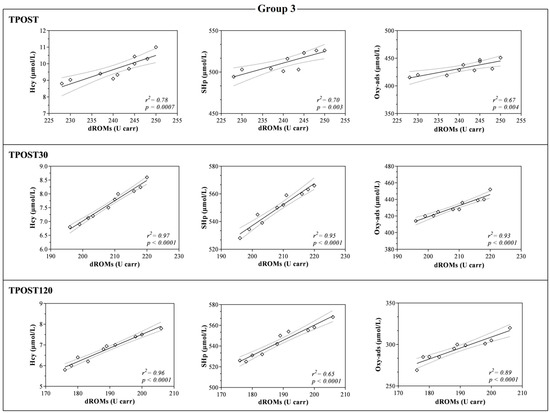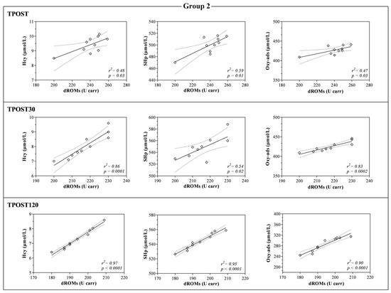 Linear regression values obtained between the serum concentration of reactive oxygen metabolites (dROMs) and the values of homocysteine (Hcy), thiol antioxidant barrier (SHp) and antioxidant barrier (Oxy-ads) obtained immediately after the race (TPOST), and after 30 (TPOST30) and 120 min (TPOST120) in Thoroughbred racehorses competing in 1600-m race (Group 2).