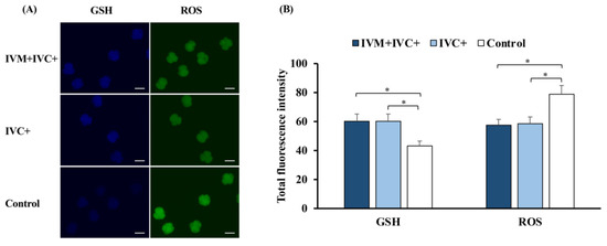 Effects of melatonin on intracellular glutathione (GSH) and reactive oxygen species (ROS) levels in in vitro-produced 4-cell embryos at 48 h of culture. (A) Representative images of embryos stained with CellTracker Blue (GSH) or with 2′,7′-dichlorodihydrofluorescein diacetate (ROS). Scale bar: 100 µm. (B) Effects of melatonin on GSH and ROS levels in embryos. Melatonin (1 nM) was added to both the maturation and culture media (IVM + IVC+ group; n = 28) or only to the culture medium (IVC+ group; n = 32). Oocytes that were matured, fertilized, and cultured in media without melatonin supplementation were used as controls (n = 30). * p < 0.03. Data are presented as the means ± SEM (three replicates).
