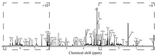 NMRProcFlow 1.3.10 (INRA UMR 1332 BFP, Bordeaux Metabolomics Facility, Villenave d’Ornon, France) [27] was used to perform PPM calibration, baseline correction, alignment, spectra bucketing, and data normalization of raw 1H NMR spectra. The DSS internal standard was taken as the chemical shift reference peak (DSS = 0.0 ppm), and the spectral images within 0.66–10 ppm were integrated to remove the chemical shift region where the water peak was located (4.67–4.86 ppm). PQN (Probabilistic Quotient Normalization) was selected for normalization. NMR spectra were preprocessed using adaptive intelligent bucketing, with buckets with a signal-to-noise ratio > 3 chosen for further investigation. The end result is a 599-bucket matrix. To increase the weight of low-intensity peaks, all NMR spectra were logarithmically transformed before multivariate statistical analysis.