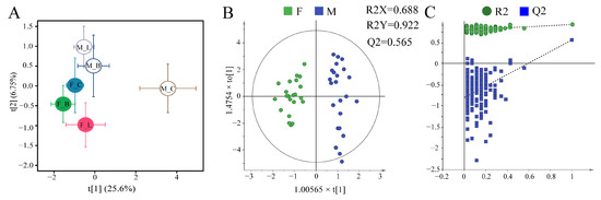 Multivariate statistical analysis plot based on 1H NMR spectra of C. hongkongensis hepatopancreas tissues. (A) PLS-DA plots for all treatments; (B) OPLS-DA score plots of male and female oysters (R2X = 68.8%, R2Y = 0.927, Q2 = 0.565, p < 0.003); (C) permutation test for the model in (B). Groups: F, female; M, male; C, control; B, Vibrio harveyi infection; L, LPS infection.
