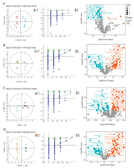 OPLS-DA score plots of 1H NMR spectra of C. hongkongensis hepatopancreas extract from different paired groups (left panel) and the corresponding model permutation test chart (middle panel) and its corresponding volcano map (right panel). (A) F_B vs F_C. (B) M_B vs M_C. (C) F_L vs F_C. (D) M_C vs M_L. Groups: F, female; M, male; C, control; B, V. harveyi infection; L, LPS infection.