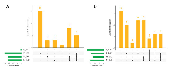 Upset diagram of C. hongkongensis hepatopancreas extracts from different paired groups. Increased metabolites (A), decreased metabolites (B). Groups: F, female; M, male; C, control; B, V. harveyi infection; L, LPS infection.