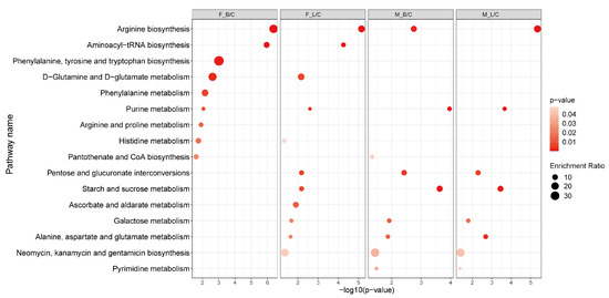 KEGG function analysis based on the differential metabolites from different paired groups. Pathways with p values < 0.05 are shown. Groups: F, female; M, male; C, control; B, V. harveyi infection; L, LPS infection.
