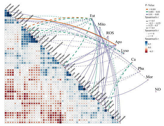 Differential metabolites and immune factors correlated by Spearman’s correlation analysis. A color gradient denoting Spearman’s correlation coefficient is shown for pairwise comparisons of metabolites. Spearman’s correlation coefficients are depicted using line size and line color denotes statistical significance. Lines: dashed, positive correlation; solid, negative connection. Apo, apoptotic ratio; Ca, calcium content; Est, esterase activity; Lyso, lysosome mass; Mito, mitochondrial mass; Mor, mortality; NO, nitric oxide level; Pha, phagocytic ratio; ROS, reactive oxygen species level. *** p < 0.001, ** p < 0.01, * p < 0.05.