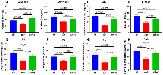 To reveal the metabolic alterations retrieved form the mitochondria histology, glucose, lipid, and protein metabolic-related indexes were detected with the liver tissue. Glucometabolic-related glucose content (Figure 2A) and amylase activity (Figure 2B) were inhibited by 6OF; protein metabolic-related alkaline phosphatase (ALP) activity (Figure 2C) was also inhibited by 6OF; lipid and fatty acid metabolic related lipase (Figure 2D), lipoprotein lipase (Figure 2E), triglyceride (Figure 2F), total cholesterol (TC, Figure 2G), and fatty acid synthetase (Figure 2H) were all inhibited by 6OF. However, the aberrant expression of these genes was rescued by emodin (6OF+E), and exhibited no significant difference with that in 6F (p ≥ 0.05) (Figure 2A–H).