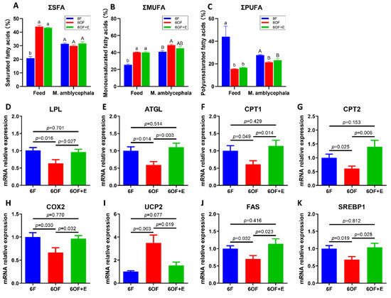 To further explore the potential alteration of fatty acid metabolism that is regulated by OF, fatty acid composition, fatty acid catabolism, and anabolism were analyzed. Fatty acid composition of the diet reveal saturated fatty acids (SFA) and monounsaturated fatty acids (MUFA) were significantly increased (p < 0.05), while the polyunsaturated fatty acids (PUFA) were significantly decreased (p < 0.05) after the oxidization of fish oil (Figure 3A–C, Table 3). However, the fatty acid composition from the whole fish reveal SFA exhibited no significant difference between 6F, 6OF, and 6OF+E (p > 0.05); MUFA in 6OF was increased, but restored to the 6F level under emodin (6OF+E); PUFA in 6OF and 6OF+E was significantly decreased (p < 0.05), and exhibited the same variation as that in the diet (Figure 3A–C, Table 3). These results indicate M. amblycephala presents positive adaptability to fatty acid metabolism under fatty acid composition alteration in the diet induced by oxidized fish oil, especially the SFA and MUFA utilization. This interesting finding inspired us to explore the fatty acid catabolic and anabolic regulation.