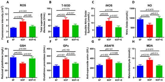 To evaluate whether dysregulated metabolism impacts antioxidant capacity, we next evaluated the antioxidant-related parameters in the liver. 6OF significantly increased the content or activity of reactive oxygen species (ROS, Figure 4A), total superoxide dismutase (T-SOD, Figure 4B), inducible nitric oxide synthase (iNOS, Figure 4C), glutathione peroxidase (GPx, Figure 4D), anti-superoxide anion (ASAFR, Figure 4E), and malondialdehyde (MDA, Figure 4F); and significantly decreased the content of nitric oxide (NO, Figure 4G) and reduced glutathione (GSH, Figure 4H). Analogously, emodin (6OF+E) also alleviates the increased or decreased activity or content to the control level after 12-weeks stimulation (p > 0.05, Figure 4A–H).