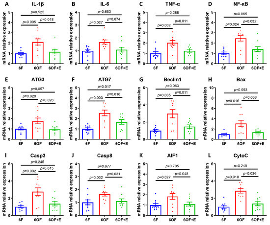To uncover whether the metabolic and physiological alternation was related to immunity and cell fate determination, transcriptional expression of inflammation, autophagy, and apoptosis-related key genes were detected. Consistently, 6OF activated inflammatory response (IL-1β, IL-6, TNF-α, and NF-κB, Figure 5A–D), cellular autophagy (ATG3, ATG7, and Beclin1, Figure 5E–G), and apoptosis (Bax, Casp3, Casp8, AIF1, and CytoC, Figure 5H–L). Simultaneously, emodin (6OF+E) alleviates the expression of these genes (Figure 5A–L), and reveals emodin exerts protective effects on inflammation and cellular homeostasis under oxidative stress. Moreover, correlation analysis (shown in Figure S2) reveal inflammation factor IL-1β was associated with apoptosis factor Bax and AIF1 in 6OF; inflammation and autophagy correlation were vanished in 6OF and 6OF+E; while apoptosis and autophagy correlation were activated in 6OF (Casp9-ATG7) and 6OF+E (Casp8-ATG3, Casp8-ATG7). These data indicate the crosstalk and dynamic equilibrium between apoptosis and autophagy determines the cell fate under oxidative stress amelioration.