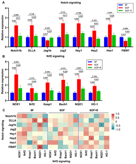 Notch-Nrf2 crosstalk was active to oxidative stress amelioration in the liver of M. amblycephala. (A,B), Transcriptional expression of key related genes under oxidative stress and emodin stimulation. (A), Notch signaling, Notch1b, Delta like A (DLLA), Jagged 1 beta (Jag1b), Jagged 2 (Jag2), Hairy/Enhancer of split related with YRPW motif 1 (Hey1), Hairy/Enhancer of split related with YRPW motif 2 (Hey2), hairy and enhancer of split-1 (Hes1), F-box and WD repeat domain-containing 7 (FBW7); (B), Nrf2 signaling, NADPH oxidase 1 (NOX1), Nuclear factor erythroid 2–related factor 2 (Nrf2), Kelch-like ECH-associated protein 1 (Keap1), BTB Domain and CNC Homolog 1 (Bach1), NAD(P)H quinone dehydrogenase 1 (NQO1), Heme oxygenase 1 (HO-1); (C), correlation analysis between Notch and Nrf2 signaling was retrieved from Pearson analysis. In (C), * represents p < 0.05, and ** represents p < 0.01. Data were analyzed by Students’ t-test, results were indicated as mean ± SEM, n = 9.