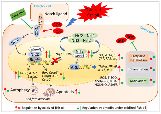 Hypothetical regulation of Notch-Nrf2 crosstalk on oxidative stress amelioration. Hypothetical regulation of Notch-Nrf2 crosstalk was raised based on the results in this study. Arrows in red color represent the regulation by oxidized fish oil, in blue color represent the regulation by emodin under oxidized fish oil. “×” represents oxidized fish oil blocks the co-regulation between Notch and Nrf2 signaling.