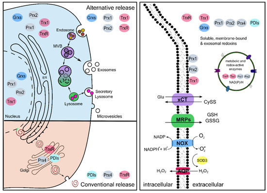 Peroxiredoxins are characterized by the Trx fold, peroxidase activity and distinct subcellular localization. They were long considered as antioxidants and unspecific peroxidases. They are, nowadays, rather considered as peroxide sensors that can transduce oxidation to substrate proteins and thereby mediate signal transduction. Prx1 and 2 have been shown to be released via exosomes. Interestingly, the secretion depends on oxidation. This involves mutating the catalytic cysteine residues, which are essential for their peroxidase function, inhibits Prx release [39]. Additionally, not only the presence of Prxs has been described in human EVs, but also the presence of their mRNAs has been found in the Evs’ lumen [33]. Prx1 and 2 were formerly described as NK-cell enhancing factors, however, the underlying regulatory mechanism was not elucidated [40]. Extracellular Prxs have been described as DAMPs and PAMPs, which specifically bind to TLR4 and are capable of activating TLR signaling and the NF-kB activation [41,42]. Studying the Exocarta and Vesiclepedia databases, we found all six isoforms to be released in extracellular vesicles. However, Prx4 is the only isoform that contains a signal peptide, and it was shown to follow the classical secretory pathway. The same is true for protein disulfide isomerases (PDIs), i.e., PDI A1, A3 and A6, which catalyze disulfide-isomerization reactions [11,12]. For instance, the function of PDIs has been linked to thrombosis, infection and inflammation, demonstrating that extracellular redox regulation is not limited to the regulation of single Cys modifications and disulfide reduction, but also the transfer of disulfides to target-soluble proteins or surface-exposed cellular structures. In fact, the metalloprotease ADAM17 is controlled via a PDI-mediated thiol switch [12]. Redox mediators, their release mechanisms and functions are summarized in Table 1.