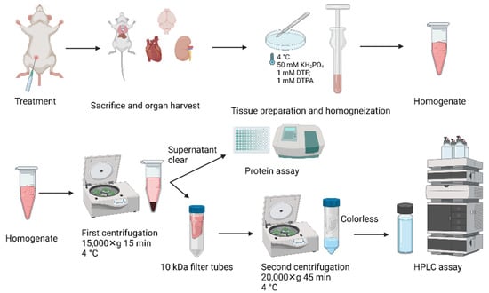 After sacrifice, rat tissues (aorta, heart, brain, kidney and liver) were immediately washed and briefly stored in ice-cold homogenization solution consisting of 50 mM potassium phosphate buffer pH 2.6 with 1 mM DTE and 1 mM DTPA. Tissue was cleaned from extra fat (aorta was cleaned in homogenization buffer under the microscope on ice). The wet weight of all the tissues was measured before homogenization. Roughly, half of a heart (~700 mg), half of a kidney (~1000 mg), similar piece of a liver or a brain (~1000 mg) and the whole aorta (~150 mg) were used for BH4 analysis. Samples were cut into small pieces, followed by glass–glass homogenization at 4 °C upon addition of 1 mL of homogenization buffer for heart, brain, kidney and liver tissue and 700 µL for aorta. The samples were centrifuged for 15 min at 15,000× g. Supernatant (slightly colored) was taken and centrifuged again through 10 kDa cut-off filters for 45 min 20,000× g. After centrifugation the completely colorless supernatant was loaded to the autosampler. All centrifugation steps and the autosampler were kept at 4 °C. Supernatant of the first centrifugation step was used for quantification of protein content by Lowry method. All work-up steps and conditions are summarized in Figure 1.