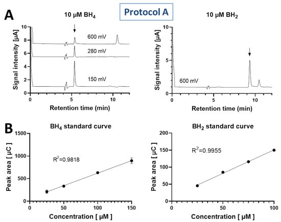 (A) Chromatograms of 25 µM BH4 and BH2 standards represented at oxidation potentials of 0, 150 and 280 for BH4 (retention time 4.56 min) and at the oxidation potential of 280 mV for BH2 (retention time 6.92 min). (B) Standard curves for BH4 and BH2 solutions, representing a linear range (BH4: 0.3–125 µM, 13 concentration values; BH2: 0.1–200 µM, 15 concentration values) with a linear regression correlation coefficient R2 of 0.99 for both standards. Data are mean ± SD of n = 3 independent measurements per data point.