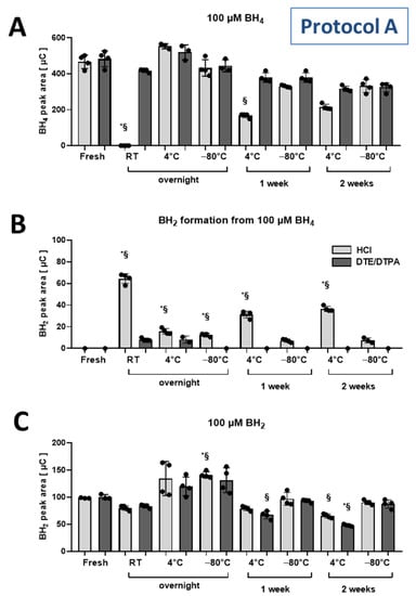 (A) Detected BH4 peak areas in solutions of BH4 (100 µM) standards (quantified as the sum of 150 mV and 280 mV oxidation potentials, eluted at 5.4 min) upon storage under indicated conditions and time. (B) Peak areas of BH2 detected (quantified at 600 mV oxidation potential, retention time 9.4 min) in the same samples. (C) Detected BH2 peak areas in solutions of BH2 (100 µM) standards (quantified at 600 mV oxidation potential, eluted at 9.4 min) upon storage under different conditions. Solvent conditions were either hydrochloric acid (HCl, 100 µM) or HCl (100 µM) with dithioerythritol (DTE, 1 mM) and diethylenetriaminepentaacetic acid (DTPA, 1 mM). Data are mean ± SD of the number of indicated independent measurements. Note: * means significantly different to fresh standard in HCl; § means significantly different to fresh standard in HCl with DTE/DTPA.