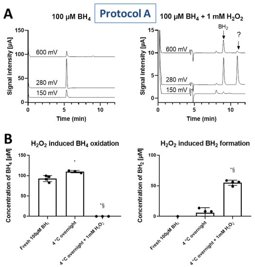 (A) Representative chromatograms showing the changes in peak intensities due to BH4, BH2 and unidentified product (marked with “?” symbol, retention time approximately 11 min) in BH4 (100 µM) solutions incubated in the presence or absence of H2O2 (1 mM). (B) Concentrations of BH4 standard and formed BH2 product (quantified as the sum of 150 mV and 280 mV oxidation potentials for BH4, and only 600 mV for BH2) were either measured in freshly prepared samples in 100 µM HCl or after incubation overnight at 4 °C or after incubation overnight at 4 °C in the presence of 1 mM H2O2 in 0.1 mM HCl. Data are mean ± SD of the number of indicated independent measurements. Note: * means significantly different to fresh BH4; § means significantly different to overnight BH4.
