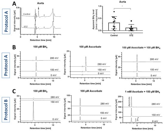(A) Representative chromatograms (detected at 280 mV oxidation potential) and determined apparent BH4 concentrations for aorta of control and diabetic (STZ) rats. Peak areas detected at the retention time of 5.4 min were converted to a BH4 concentration using the BH4 standard curve and was finally normalized to mg protein as estimated by Lowry method in the tissue homogenate supernatant. Data are mean ± SD of the number of indicated independent measurements. Note: * means significantly different to control rats. (B) Representative chromatograms showing co-elution of BH4 and ascorbate standards using the initial HPLC method (protocol A). (C) Representative chromatograms show clear separation of BH4 and ascorbate standards using the optimized HPLC method (protocol B).