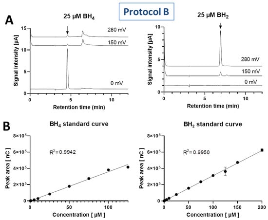 After optimization of the HPLC method by increasing the pH of the mobile phase (second protocol B: 50 mM potassium phosphate, pH 4.5), we were able to separate the BH4 signal from the interfering ascorbate peak (Figure 5C). BH4 was detected at the lower potential of 0 mV and showed a peak at a retention time of 4.56 min, whereas BH2 was detected at the higher potential of 280 mV and showed a peak at a retention time of 6.92 min (Figure 6A). Standard curves for both BH4 and BH2 were linear in the concentration range of 0.3/0.1 to 125/200 µM with R2 values of >0.99 (Figure 6B).