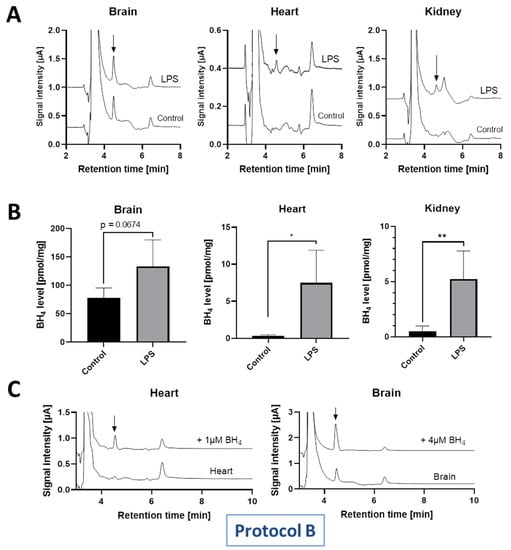 Unfortunately, the BH4 signals in the tissues of control rats were then too low to observe a significant decrease in the tissues of diabetic rats (not shown). We therefore chose to monitor the induction of BH4 under inflammatory conditions instead, using LPS-induced endotoxemia. We successfully detected BH4 in the brain, heart and kidney of control and LPS treated rats in the concentration range more similar to previously published data (Table 2). LPS-induced sepsis is known to increase nitric oxide and BH4 levels via inflammatory pathways via induction of iNOS [19,20,21,22]. Chromatogram peaks of BH4 in the brains were detectable in control and LPS-treated rats (Figure 7A). Heart and kidney levels of BH4 showed a significant increase in LPS-treated animals as compared to the control, while brain BH4 concentrations were increased in LPS animals, at least by trend (p-value 0.067) (Figure 7B). In order to prove the authenticity of the potential BH4 signal in the heart and brain, the samples were spiked with BH4 standard (Figure 7C).