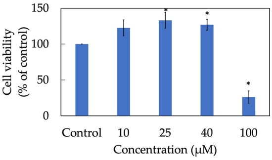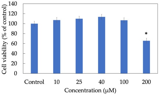 Cell metabolism and survival rate play a key role in screening appropriate doses of drug that do not lead to toxicity or cell death but result in therapeutic effectiveness. MTT assay is the most frequently used to measure cellular metabolic activity as an indicator of cell viability, proliferation and cytotoxicity. HaCaT keratinocytes were acquired from Istituto Zooprofilattico Sperimentale della Lombardia e dell’Emilia Romagna (Brescia, Italy). Culture medium included Gibco Dulbecco’s Modified Eagle Medium DMEM (Himedia Laboratories, Mumbai, India), 10% fetal bovine serum (Thermo Fisher Scientific, Naucalpan de Juarez, Mexico) and 1% penicillin–streptomycin (Biological Industries, Connecticut, NE, USA). Cells were grown in an incubator (Thermo Fisher Scientific, Waltham, MA, USA), temperature was set at 37 °C and 5% CO2. To begin with, HaCaT cells were seeded in a 96-well plate, specifically, 1 × 104 cells suspended in 100 µL of culture medium per well in 24 h prior to treating. In terms of sample preparation, morin was originally dissolved in dimethyl sulfoxide (DMSO), liposomal morin was prepared in PBS, the solutions were then diluted in DMEM to desired concentrations (10, 25, 40, 100 and 200 µM, respectively). The cells in each well were washed with 100 µL of PBS before being exposed to morin and liposomes for the following 24 h. On the third day, the medium with the active compounds was removed from cells by washing with PBS and 150 µL of 0.5% methyl thiazolyl tetrazolium (MTT) solution was then added into each well. The plate was stored back into the incubator and left for reaction. After 3 h, MTT solution was discharged from wells. Purple formazan crystals created by the reduction of a yellow tetrazolium salt was dissolved in DMSO solution. Optical density at a wavelength of 550 nm (OD550) was determined using a microplate spectrophotometer (SpectraMax ABS® ABS Plus, Molecular Devices, San Jose, CA, USA).