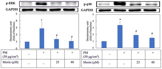 The anti-aging effect of morin and liposomal morin in keratinocytes were analyzed by Western blotting. Firstly, 4 × 105 HaCaT keratinocytes were seeded in a 6 cm dish and cultured for 24 h in the incubator set with the condition described above. PM were suspended in PBS (10 mg/mL) and sonicated for 10 min. The cells were then treated with morin or liposomal morin prepared in DMEM solution at various concentrations for 3 h. Subsequently, the HaCaT cells were induced with PM suspension (50 µg/cm2). After 2 or 6 h, the whole proteins in treated cells were extracted using RIPA Lysis Buffer (Merck Millipore, Burlington, MA, USA) and collected into 1.5 mL tubes, centrifuged at 12,000 rpm for 10 min. The protein contents were then determined by the BCA Protein Assay Kit (Thermo Fisher Scientific, Waltham, MA, USA). An equal quantity of protein in each sample was loaded into sodium dodecyl sulfate-polyacrylamide gel electrophoresis (SDS-PAGE) for separating. Proteins were blotted onto polyvinylidene difluoride (PVDF) membranes (Merck Millipore, Burlington, MA, USA). The membranes were then blocked for an hour and washed with tris-buffered saline (TBS) and 1% tween-20 before being incubated overnight at 4 °C with primary antibodies including p-p38 (1:1000; #09-272, Merck Millipore), p-ERK (1:1000; #05-797R, Merck Millipore), MMP-1 (1:1000; 10371-2-AP, Proteintech Group) and GAPDH (1:1000; sc47724, Santa Cruz Biotechnology, Dallas, Germany) as the internal control. The membranes were washed with TBS prior to being incubated with horseradish peroxidase (HRP) conjugated secondary antibodies which were already reacted with chemiluminescence reagents (ECL; Thermo Fisher Scientific) for an hour at room temperature the following day. Protein signaling bands were achieved by Touch Imager (e-BLOT; Shanghai, China) and analyzed using ImageJ application.