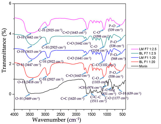 2.9. Intermolecular Bonding of Morin and Liposomes by Fourier Transform Infrared Spectroscopy (FTIR)