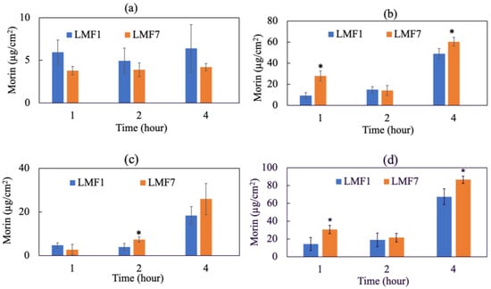 According to the standard guideline of the European Cosmetic Toiletry and Perfumery Association (COLIPA), the Franz Diffusion Cell (FDC) has been employed to measure kinetics of percutaneous absorption of morin and liposomal morin. The FDC system basically consists of two primary chambers: upper donor and lower receptor chamber made with glass, separated by a membrane; in this case pork skin was used. Pork skin samples were purchased from the local traditional market. Areas of skin that did not have the intact barrier or were compromised with any wounds which could result in incorrect data were removed. A 4 cm2-(2 cm × 2 cm)-sized pork skin was used for each FDC and placed onto the FDC with the stratum corneum facing upwards; the receptor chamber below was filled with a buffer solution containing 0.14 M NaCl, 2 mM K2HPO4, and 0.4 mM KH2PO4 (pH 7.4). A small magnetic stirring bar was placed at the bottom of the receptor chamber in order to maintain the constant compound concentration and temperature by the circulation of water at 32 °C from a water bath. The stirrer speed was set at 600 rpm during the experiment. The sample preparation included dissolving morin, liposomal morin in water comparable to 1 mg of morin per 1 mL of distilled water. Then 200 µL of testing samples were loaded onto the donor chamber in direct contact with the outer-most layer of pork skin. After 1, 2, and 4 h, testing compounds and skin samples were collected for analysis. The stratum corneum layer was removed by stripping 15–20 times with 3 M Transpore tapes. The remaining skin samples were heated at 80 °C to facilitate the separating of the viable epidermis and dermis. They were then cut into smaller pieces with a scalpel. The individual skin layer of each testing sample was soaked into methanol and placed in an ultrasonic bath sonicator for 1 h to extract the remaining morin out of the skin. The extracts were filtered with 0.45 µm pore-sized- membrane before HPLC analysis with the method mentioned earlier.