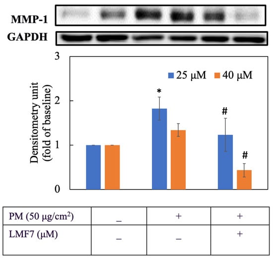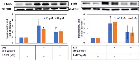 33]. Therefore, two concentrations, 25 μM and 40 μM of morin and LMF7, were used to evaluate inhibitory capacity on PM-induced ROS, expression of p-ERK, p-p38 and MMP-1 in HaCaT cells. Our study indicated that LMF7 displayed a more powerful suppression on MMP-1 compared to morin in free form, demonstrating that liposomal vesicles could act as the carriers and that successfully released morin to provide skin anti-aging activity.
