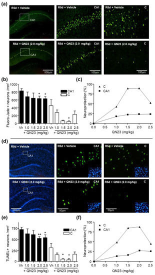Interruption of blood supply to the brain for 15 min followed by reperfusion induced neuronal death, especially in the hippocampal CA1 and cortical regions of the brain, which could be observed by Fluoro-Jade B staining after 5 days of reperfusion. In the experiments summarized in Figure 1, fewer dead neurons were observed after QN23 treatment than after treatment with vehicle in the entire concentration range analyzed, both in the hippocampal CA1 region and cerebral cortex (Figure 1a,b). In particular, when treated with 2.0 or 2.5 mg/kg of QN23, the neuronal death was significantly reduced in the hippocampal CA1, whereas in the cerebral cortex it was when treated with 2.0 mg/kg of QN23. Expressing the induced neuroprotection as a percentage, and considering the number of dead neurons present in the vehicle group as 0% neuroprotection, a dramatic increase in neuroprotection could be observed for QN23 at 1.5 and 2.0 mg/kg in the cortical region, with this effect being less sharp in the hippocampal CA1 region (Figure 1c).
