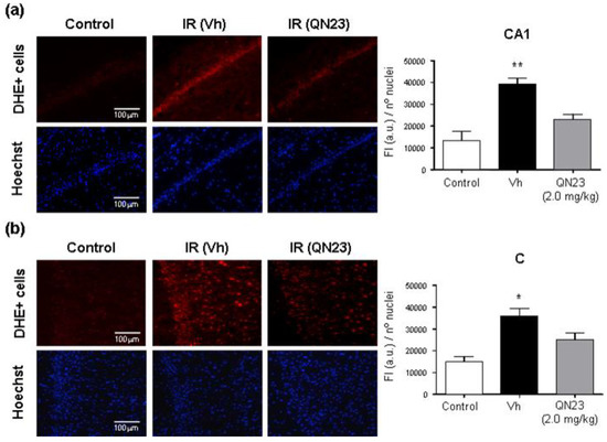 The results presented in Figure 3 show that, as a consequence of the transient ischemic episode, a significant increase in the fluorescence intensity, meaning a higher production of radical species, was observed in the vehicle-treated group compared to the basal control group (2.9- and 2.4-fold increase in the hippocampal CA1 and cortical region, respectively). When the animals were treated with QN23 2.0 mg/kg, the fluorescence intensity of ROS-reacted DHE decreased significantly compared with the vehicle-treated group, being slightly higher than the control group but with no statistical difference. The increase in the fluorescence intensity—i.e., increased ROS levels—due to the experimental ischemia was observed in the CA1 and cortical regions, and in both regions QN23 significantly decreased the fluorescence intensity rise. Control experiments were carried out as described in Figure 3, injecting fluorescent oxidized DHE to verify that the permeability of DHE into the brain was not different between control and ischemic animals (results not shown).