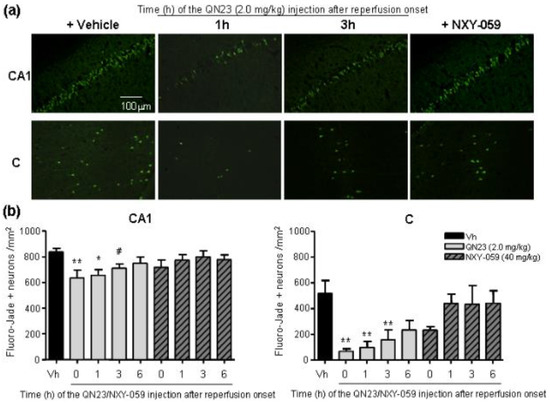Therapeutic window of QN23 studied by Fluoro-Jade B assay (neuronal death). Ischemic animals were treated with vehicle (Vh), QN23 (2.0 mg/kg), or NXY-059 (40 mg/kg) by an intravenous injection at reperfusion onset (0 h), or at 1, 3, or 6 h of reperfusion after global cerebral ischemia. Neuroprotection was evaluated after 5 days of post-ischemic reperfusion. (a) Representative images of Fluoro-Jade B-stained hippocampal CA1 (CA1) and cortical (C) brain sections of vehicle- and QN23-treated animals at 1 h or 3 h of reperfusion and NXY-059-treated animals at 0 h of reperfusion. Dead neurons observed after Fluoro-Jade B staining within the CA1 and C regions were imaged by fluorescence microscopy (in green) and counted as described in the Materials and Methods section. (b) Bar graphs represent the neuronal death quantified in brain sections from vehicle-, QN23-, and NXY-059-treated animals in CA1 and C regions. For each group, 6–10 independent animals were averaged (10 animals treated with vehicle, 6–7 animals per QN23 treatment, and 6 animals per NXY-059 treatment); error bars indicate the SE. * p < 0.05 and ** p < 0.01, compared with vehicle (Vh) by Dunnett’s post-test, and # p < 0.05, by Student’s t test, after ANOVA.