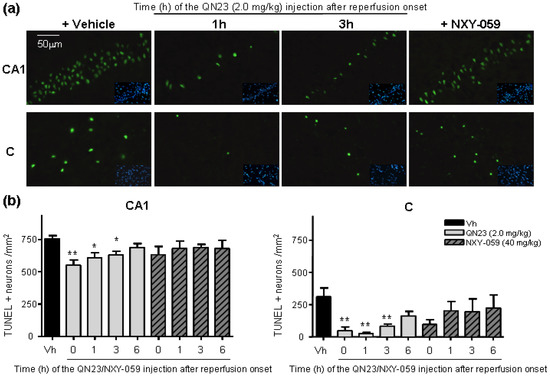 Therapeutic window of QN23 studied by TUNEL assay (apoptosis). Brain sections of ischemic animals from Figure 4 were used for apoptosis detection by TUNEL assay in the hippocampal CA1 (CA1) and cortical (C) regions and imaged by fluorescence microscopy (in green). (a) Representative images of CA1 or C regions from vehicle- and QN23-treated animals at 1 h or 3 h of reperfusion and NXY-059-treated animals at 0 h of reperfusion, after apoptosis detection by TUNEL assay and the corresponding Hoechst counterstaining. TUNEL-positive cells detected within CA1 and C regions were counted as described in the Materials and Methods section. (b) Bar graph representations of TUNEL-positive cells quantified in brain sections from vehicle-, QN23-, and NXY-059-treated animals in CA1 and C regions. For each group, 6–10 independent animals (as described in Figure 4) were averaged; error bars indicate the SE. * p < 0.05 and ** p < 0.01, compared with vehicle (Vh) by Dunnett’s post-test, after ANOVA.