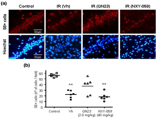 S6 protein immunostaining was performed in brain sections from control or ischemic-reperfused animals for 11 weeks and observed in the CA1 region of the hippocampus. Viable neurons were stained by S6, and its number was compared between the different experimental groups (control, vehicle, QN23, or NXY-059 (Figure 7)). As shown in the figure and the corresponding data quantification graph, fewer S6-positive cells (i.e., viable neurons) were observed in ischemic animals treated with vehicle solution (Figure 7a, IR Vh) compared to control animals. These results show how 15 min of cerebral ischemia followed by reperfusion damaged neuronal cells within the CA1 region of the hippocampus—the cerebral region involved in short-term memory and spatial memory storage—and that even 11 weeks of recovery after reperfusion failed to overcome this situation, inducing irreparable damage to an essential brain structure. Remarkably, treatment with NXY-059 (Figure 7a, IR NXY-059) did not avoid this issue, with a similar number of positive cells observed as in the vehicle group (Figure 7b). In contrast, treatment with QN23 (Figure 7a, IR QN23) preserved a large number of viable neurons compared to the control group, with no significant differences between these two groups (Figure 7b). In addition, the morphology and disposition of the neurons were similar to those of control animals, in what represents a long-term effect of QN23 in the structural integrity preservation of the hippocampal CA1.