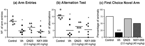 For the assessment of the exploration activity, vehicle-, QN23-, and NXY-059-treated animals were compared to a control group. As shown in Figure 8a, animals from the vehicle group showed fewer arm maze entries, in a similar number to the animals treated with NXY-059 compared to control. In contrast, animals treated with QN23 showed a higher number of new entries (differences not significant compared with control), accounting for a preserved neurological function.