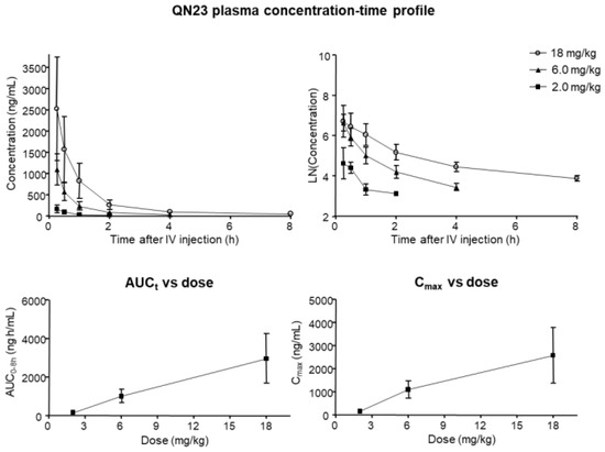 A study of the toxicokinetics of QN23 was carried out by determining the concentration of QN23 in plasma after a single bolus intravenous injection of our working dose of 2.0 mg/kg, and higher doses of 6.0 and 18 mg/kg. In these assays, a vehicle solution with a higher concentration of polyethylene glycol 400 was necessary for the solubilization of the elevated doses of QN23 tested. Plasma samples were collected 0.25, 0.5, 1, 2, 4, and 8 h after administration, and QN23 concentration was determined by LC/MS-MS (Figure 10). A non-compartmental analysis was used for the calculation of the pharmacokinetic parameters (Table 1).