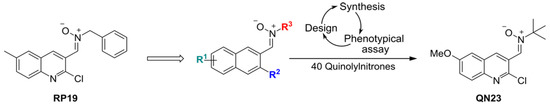 In spite of it, NXY-059 served to make clear the therapeutic potential of nitrones as candidates for the treatment of different diseases, especially ischemic stroke. For many years, our group has been developing new nitrone-derived compounds based on diverse scaffolds as potential drug candidates for the treatment of the ischemic neuropathology. Apart from the cholesterol-derived nitrone candidate ISQ-201 [18], our group identified a set of nitrones bearing a quinoline core as interesting neuroprotective compounds in oxygen and glucose deprivation (OGD) injury on primary neuronal cultures [19]. One of these quinolyl nitrones, named RP19, was identified as the most potent of the set, with a promising neuroprotective effect against OGD insult, and thus prompted its study on in vivo stroke experimental models, confirming its neuroprotective effect [20]. Further exploration of the quinoline core and screening of more than 40 quinolyl-derived compounds in our phenotypical OGD model has led to new interesting candidates, with the one identified as QN23 being our current lead quinolyl nitrone [21,22]. QN23 presented higher protection and tolerability than previous RP19, and higher potency than NXY-059, on primary neuronal cultures subjected to OGD. Furthermore, QN23 had a remarkable antioxidant profile, being particularly strong against hydroxyl radical, which was complemented by studies in primary neuronal cultures in which QN23 reduced reactive oxygen species (ROS) and lipid peroxidation levels [22]. The in vivo study of its neuroprotective activity revealed decreased levels of neuronal death and apoptosis and an improvement in neurological function, after intraperitoneal injection of QN23 at the onset of post-ischemic reperfusion [22]. In addition, the study of the anti-inflammatory activity of QN23 in the carrageenan-induced rat paw edema experimental model showed anti-inflammatory properties [22]. In our search for new therapeutic compounds for the treatment of ischemic stroke, Scheme 1 shows QN23 development as the lead compound among the new quinolyl drug candidates. In order to keep with its development, new evidence of antioxidant activity and relevant preclinical characterization studies of QN23 are described in this report.