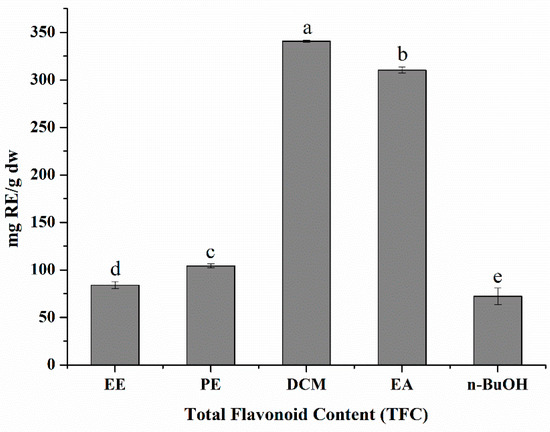 The total flavonoids content (TFC) of the ethanol extract and its fractions of S. doederleinii expressed rutin equivalents (RE) of dry weight sample. EE, ethanol extract; PE, petroleum ether; DCM, dichloromethane; EA, ethyl acetate; n-BuOH, n-butanol. All the data were expressed as mean ± standard deviation (n = 3). The letters (a–e) denote that the means are significantly different at a level of p < 0.05 (n = 3) by one-way ANOVA DMRT.