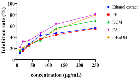 The ethanol extract and its fractions were evaluated for their scavenging potential and expressed different inhibition percentages. From Figure 2, the EA fraction expressed the highest inhibition percentage (DPPH) at a sample concentration of 250 µg/mL, followed by n-BuOH, DCM, ethanol extract, and PE with 80.9, 79.7, 69.5, 56.6, and 55.4%, respectively. The IC50 values for ethanol extract, its fractions, and positive controls were shown in Table 1. The EA fraction exhibited the best antioxidant activity, followed by DCM according to their IC50 values, while ethanol extract exhibited the lowest activity. However, the FRAP assay indicated that the DCM fraction had the highest reducing ability, followed by the EA fraction with 2.6 ± 0.1 and 1.7 ± 0.0 mmol Fe2+/g, respectively. Our fraction exhibited a slightly lower antioxidant activity compared to the DPPH assay results reported by Wang et al. [32]. In both assays, the ethanol extract and PE fraction exhibited the lowest scavenging activity, while both the DCM and EA fractions depicted strong activities, which were closely attributed with their TFC yields.