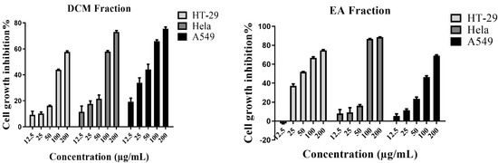 Antiproliferative activity in inhibition rate (%) at different concentrations of DCM (dichloromethane) and EA (ethyl acetate) fractions, respectively, against cancer cell lines HT-29, Hela, and A549 by the MTT assay. The cell growth inhibition rate of the ethanol extract, petroleum ether, and n-butanol could be expressed at a higher concentration than 200 µg/mL. The solvent’s inhibition rate was near zero value on all the cell lines. The data were expressed as mean ± SD (n = 3).