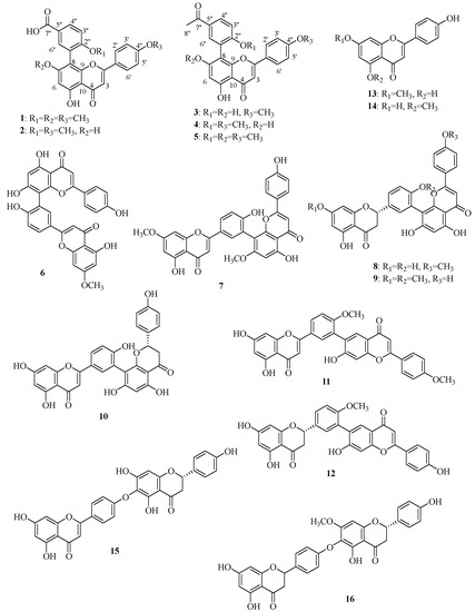 The structures of 12 other known compounds, 2 and 6–16, were established by comparison of their spectroscopic data with those reported in the literature as 3-(5,7-dihydroxy-2-(4-methoxy-phenyl)-4-oxo-4H-chromen-8-yl)-4-methoxy-benzoic acid (2) [44], Sequoiaflavone (6) [45], 7,7″-dimethyl ether amentoflavone (7) [22], 2,3-dihydro-4′′′-methyl ether amentoflavone (8) [46], 2,3-dihydro-7,4′-dimethyl ether amentoflavone (9) [47], 2″,3″-Dihydroamentoflavone (10) [48], 4′,4′′′-dimethyl ether robustaflavone (11) [47], 2,3-dihydro-4′-methyl ether robustaflavone (12) [49], 5,4′-dihydroxy-7-methoxyflavone (13) [50], thevetiaflavone (14) [51,52], 2″,3″-dihydrohinokiflavone (15) [53], and 7″-methyl ether tetrahydrohinokiflavone (16) [54].