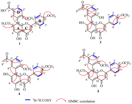 Compound 5 was isolated as a yellow powder. It shared the same skeleton structure with compounds 3 and 4 but with three methoxy groups. 1H NMR and 13C NMR data gave the molecular formula as C26H22O7. The 1H NMR and 13C NMR spectroscopic data (Table 3) of 5 closely resembled that of 4, except that the hydroxyl at C-7 of ring A was substituted by a methoxy group. The HMBC studies of this compound indicated that the three methoxy groups are attached at C-7, C-4′, and C-2″, as indicated in Figure 5. Hence, compound 5 was determined as 8-(5-acetyl-2-methoxyphenyl)-5-hydroxy-7-methoxy-2-(4-methoxyphenyl)-4H-chromen-4-one [43]. The spectroscopic data of 5 is also being reported for the first time in this study, as well as its isolation from natural resources.