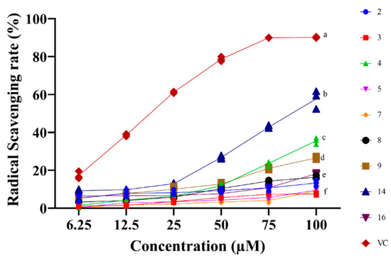 Free radical scavenging rates of isolated compounds from S. doederleinii by DPPH assay. The positive control used was Vitamin C (VC). Letters (a–f) indicate that the values are significantly different at a level of p < 0.05 (n = 3) by one-way ANOVA DMRT.