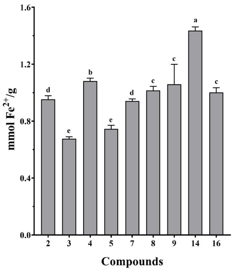 Antioxidant activities of isolated compounds from S. doederleinii evaluated by FRAP assay. The data were expressed as means ± SD (n = 3). The mean values denoted with letters (a–e) are significantly different at a level of p < 0.05 (n = 3) by one-way ANOVA DMRT.