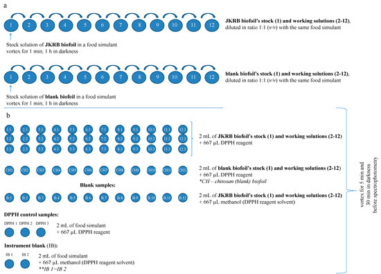 Each stock and working solution (2 mL) was transferred in triplicate (in the case of JKRB biofoil) or in one parallel (in the case of blank biofoil) into another vials to which DPPH reagent (667 µL of 200 µM methanolic solution of DPPH) was immediately added (solutions labeled with A in Equation (1) [37]; Scheme b in Figure 2). To subtract the absorbance corresponding to the color of the JKRB biofoil leachates from the absorbance corresponding to the positive DPPH reaction color, blank samples were also prepared in one parallel, so that to 2 mL of stock and working solutions, 667 µL of methanol (reagent solvent) was added (solutions labeled with B, Equation (1) [37]; Scheme b in Figure 2). For DPPH control samples, 2 mL of food simulant was mixed with 667 µL of DPPH reagent (solutions labeled with C, Equation (1) [37]; Scheme b in Figure 2). An instrument blank (2 mL of food simulant mixed with 667 µL of methanol) was also prepared (Scheme b in Figure 2).