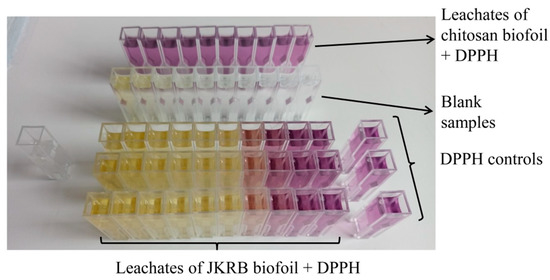 An example of a DPPH assay executed on chitosan (blank) and JKRB biofoils using 50% ethanol(aq) as a food simulant. Different dilutions of leachates of JKRB biofoil to which DPPH was added were tested in three parallels. Different dilutions of leachates of chitosan (blank) biofoil with exposure to DPPH reagent were tested in one parallel. Blank samples (leachates of JKRB biofoil to which reagent solvent—methanol was added) were also measured to subtract the absorbance corresponding to the color of the JKRB biofoil leachates themselves. Moreover, a blank for the spectrophotometer and 3 DPPH controls were prepared.