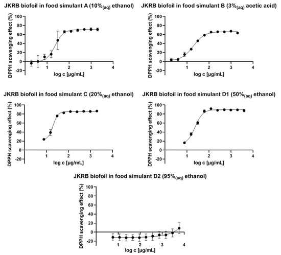 A spectrophotometric DPPH assay (example shown in Figure 3) demonstrated the antioxidant activity of the food simulants in contact with the JKRB biofoil, while the food simulants in contact with the chitosan (blank) biofoil did not show antioxidant activity. The antioxidant activity was confirmed with all tested liquid food simulants (A, B, C, and D1), except with 95% ethanol(aq) (simulant D2) after exposure to JKRB biofoil. The IC50 values (mg mL−1; theoretical “concentration” of active biofoil relative to the volume of liquid food simulant) were determined using GraphPad Prism 9 software, San Diego, CA, USA [38] (Figure 4 and Table 1).